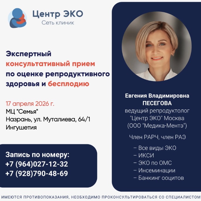 17 апреля 2026 года в г. Назрань, Республика Ингушетия, ведущий репродуктолог клиники ООО «МЕДИКА-МЕНТЭ» Москва, Песегова Евгения Владимировна, проведет консультативные приемы по бесплодию с целью отбора пациентов на ЭКО в рамках программы ОМС.