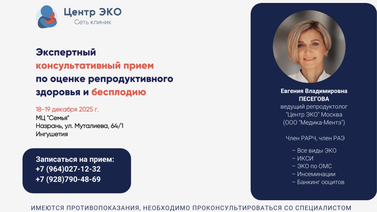 18-19 декабря 2025 года в г. Назрань, Республика Ингушетия, ведущий репродуктолог клиники ООО «МЕДИКА-МЕНТЭ» Москва, Песегова Евгения Владимировна, проведет консультативные приемы по бесплодию с целью отбора пациентов на ЭКО в рамках программы ОМС.